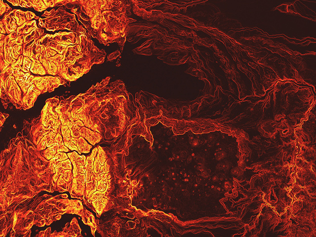 Faite à partir de données topographiques numériques récoltées par la navette spatiale de la Nasa, cette carte montre les reliefs en fausses couleurs : en noir, les surfaces plates, en rouge, les pentes moyenne proche de 20°, et en jaune, les pentes les plus raides, supérieures à 40°. Elle a été réalisée par les géologues français du laboratoire Géosciences de Montpellier pour préparer leurs futures missions sur le terrain, avec l'objectif de reconstituer les changements morphologiques et géodynamiques de la Patagonie sur les dix derniers millions d'années.