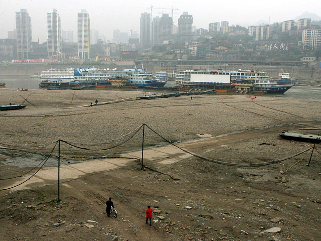 La Chine connaît actuellement la sécheresse la plus grave de son histoire. Ici, dans le port fluvial de Chongqing, au confluent du Yangzi Jiang et du Jialing, les bateaux accostent le long d'un immense banc de sable mis à nu par le manque d'eau. Au moins un million d'habitants de cette ville – et cinq millions dans la région du Sichuan – sont menacés de manquer d'eau potable. Cette situation est due à une série de sécheresses causées par des températures anormalement élevées.