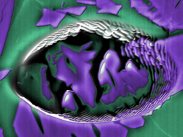 Eh bien, non ! Il s'agit d'un morceau de la météorite Semarkona vu au microscope, en fausses couleurs (en violet, cristaux de clinopyroxène et, en vert, la matrice vitreuse) sur lequel la sonde qui a servi à le dater a laissé cette trace en forme d’œil. Grâce à une technique inédite mise au point par une équipe de Nancy*, on sait que cette météorite s’est formée moins d'un million d'années après le début de la naissance du système solaire (4,6 milliards d'années). Cette méthode utilise en effet l’aluminium 26, isotope radioactif de l’aluminium qui n’existe plus aujourd’hui car il se transforme en magnésium 26 au cours du temps mais qui était présent lors de la naissance du système solaire.
