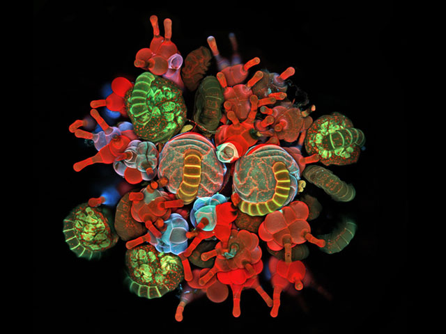 Réalisée au microscope confocal à très faible profondeur de champ, cette image montre un bouquet de sporanges (remplis de spores) et de poils protecteurs appelés paraphyses. Ces organes appartiennent à Polypodium virginianum, un polypode ou fougère à rhizome rampant de la côte est des États-Unis. Son auteur est le Dr Igor Siwanowicz de l’institut médical Howard Hughes (Virginie). Il est arrivé en troisième position du concours Olympus BioScapes 2012, après avoir obtenu le premier prix en 2010.