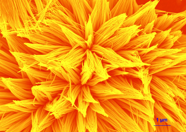 Ces « poils » orange fluo qui poussent comme des épines d’oursin sont des nanofils d’oxyde de zinc – encore appelé zincite ou blanc de Chine – mis au point à l’Institut Charles-Gerhardt (Montpellier). Pressenti comme l’un des possibles avenirs de l’énergie solaire, ce nanomatériau entre dans la composition des cellules photovoltaïques dites « à colorants ». Moins coûteuses que les cellules classiques en silicium, ces cellules ont l’avantage d’être souples. Elles pourraient donc facilement s’intégrer à des tissus. Finie l’électricité statique, le pull de l’avenir fournira de l’électricité photovoltaïque !