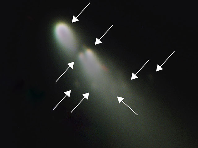 En 1995, les astronomes avaient pu observer la comète 73P/Schwassmann-Wachmann 3 se briser en plusieurs morceaux. Alors qu’elle repasse aujourd’hui tout près de la Terre, force est de constater que la comète poursuit sa lente désintégration (photo). Dans la nuit du 23 au 24 avril, les astronomes du Very Large Telescope (au Chili) ont même pu observer qu’un morceau qui venait de se détacher de la comète se désagrégeait à son tour. Entre le 11 et le 14 mai, 73P/Schwassmann-Wachmann 3 passera à moins de 12 millions de kilomètres de notre planète. En fonction de sa luminosité, elle pourrait être visible à l’œil nu ou dans de petits instruments.