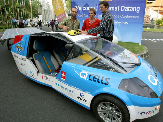Un taxi insolite a fait son apparition à Nusa Dua le 4 décembre, à l’occasion de la Conférence internationale sur le climat. Imaginé par un Suisse, Louis Palmer, qui voulait faire le tour du monde « sans polluer », ce véhicule prototype se compose d’une voiture à trois roues et d’une remorque équipée de 6 m2 de panneaux solaires qui alimentent une batterie lui donnant une autonomie de 100 km. Parti de Suisse le 3 juillet, il a mis six mois à rejoindre Bali où il a fait sensation auprès de nombreux conférenciers désireux d’essayer ce drôle de taxi.