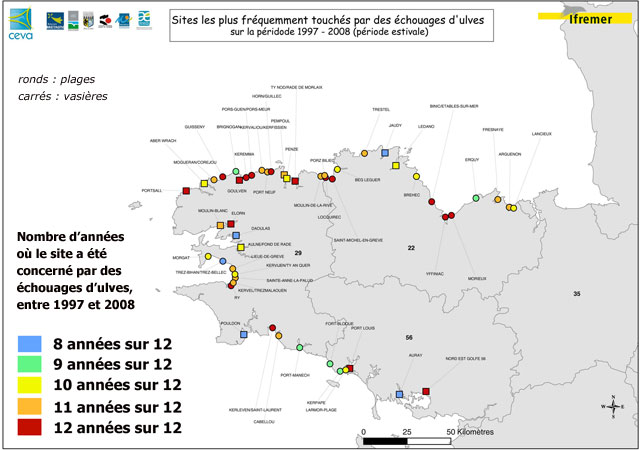 Cette carte indique les sites les plus touchés par les échouages d¹ulves (algues vertes) durant la période estivale entre 1997 et 1998. L¹ensemble du linéaire côtier est survolé lors des grandes marées. Les sites sont classés comme touchés à partir du moment où les dépôts sont décelables d'avion et que les contrôles de terrain mettent en évidence des proportions anormales d¹ulves. Certains sites sont de très petite taille et ne correspondent pas à la description classique de « marée verte ». Certains secteurs n¹étaient pas survolés les premières années et sont donc sous comptabilisés. Enfin, certaines vasières ne sont pas représentées ici, alors qu'elles sont systématiquement touchées les dernières années du suivi.