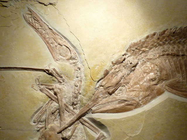 Il y a 125 millions d'années, trois animaux sont morts simultanément. Ce fossile retrouvé dans les anciens lacs Solnhofen, dans l'actuel Bavière, en témoigne. Un poisson de soixante centimètres de long, l’Aspidorhynchus, tient dans sa gueule l'aile d'un ptérosaure. Ce reptile volant s'est fait attraper alors qu'il venait lui-même de pêcher un petit poisson