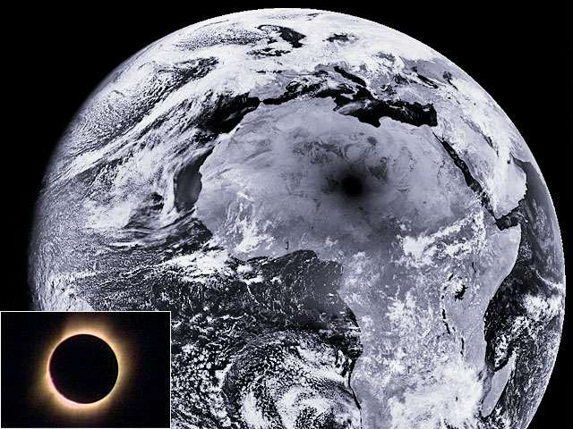 La quatrième éclipse totale de Soleil du XXI° siècle a pu être observée de l'espace grâce au satellite européen Eumetsat. L'ombre de la Lune est très nettement visible sur le continent africain. En encadré : le phénomène vu depuis la Terre.