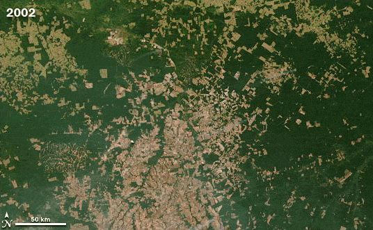 Deux images de la même région de l’État du Mato Grosso, l’État brésilien le plus concerné par la déforestation, réalisées grâce au spectroradiomètre MODIS du satellite Terra, l’une prise en 2002, l’autre en 2006, permettant de visualiser le recul de la forêt, en vert, sous l’effet de la déforestation.