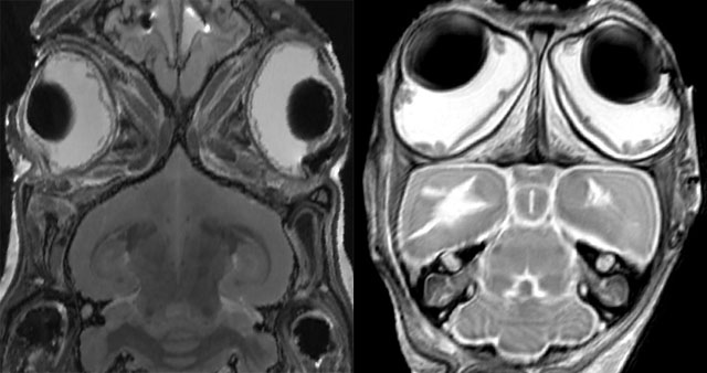 Non, répondent des chercheurs de l’université de Liverpool après avoir étudié, notamment par IRM, 51 espèces de mammifères (à gauche, un lapin, à droite, un chat). D’après leurs résultats, le cerveau des mammifères peut faire face à toutes les sollicitations survenant lors de la course, quel que soit l’endroit où sont placés les yeux : devant, latéralement ou même à l’arrière. Source : Journal of Anatomy, février 2010, DOI 10.1111/j.1469-7580.2010.01211.x