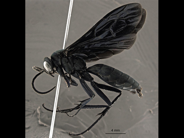 Cette guêpe noire, qui mesure presque trois centimètres de long, appartient à une nouvelle espèce : Abernessia capixaba. Espèce endémique au Brésil, elle est de la grande famille des pompiles, les prédateurs des araignées. Pour se reproduire, cette guêpe paralyse sa proie en la piquant, puis pond un œuf dans son abdomen. Ce "nid" est ensuite méticuleusement enterré.