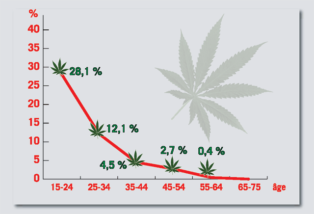 Comme le montre ce graphique, le cannabis est surtout consommé par les plus jeunes. Si l’on regarde de plus près la consommation des 15-25 ans, les données de l’enquête EROPP 2002 révèlent qu’environ 40 % des 17-20 ans ont fumé du cannabis au moins une fois au cours de l’année, contre 30 % des 21-22 ans et 20 % après 25 ans. On pourrait en déduire que la consommation de cannabis diminue avec l’âge. Mais ce serait oublier que les 17-20 ans d’aujourd’hui ne sont pas ceux d’hier… Il faudra donc attendre encore quelques années pour voir si, en vieillissant, ils auront réduit leur consommation…Source : Enquête EROPP 2002 de l’Observatoire français des drogues et des toxicomanies (OFDT) menée en population générale par téléphone auprès de 2000 personnes âgées de 15 à 75 ans.