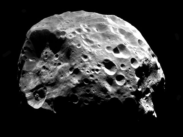10 juin 2004 : Portrait de l’une des lunes de Saturne pris par la sonde Cassini-Huygens. Ce bloc de roches et de glaces de 220 km de diamètre est sans doute issu de la ceinture de Kuiper, région connue pour ses nombreuses comètes.