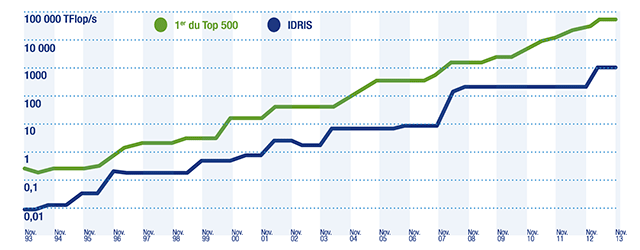 Ce schéma montre l'évolution comparée des performances crêtes entre le n°1 du Top 500 et les calculateurs de l’Idris sur la période 1993-2013.