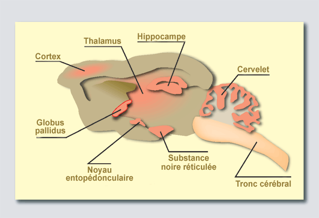 Dans ce cerveau de rat, les zones rosées correspondent aux concentrations les plus importantes de récepteurs cannabinoïdes. La diversité de la localisation de ces récepteurs permet de penser que le cannabis peut agir sur différentes fonctions telles que la mémoire, l’équilibre ou le contrôle des mouvements.Source : Jean-Pol Tassin, Inserm/Collège de France (d’après Herkenham)