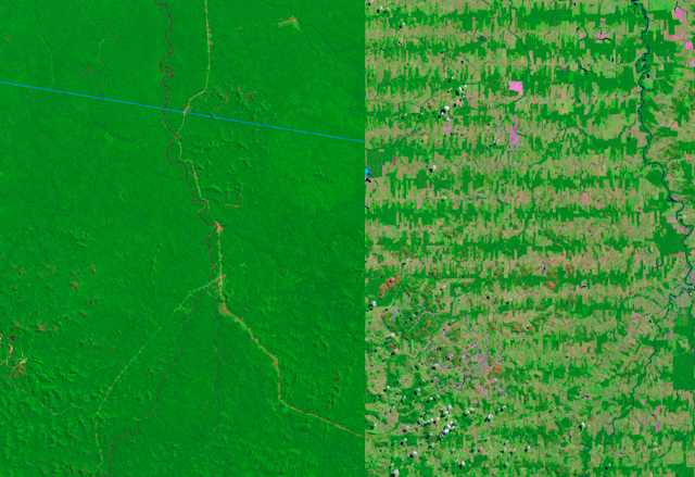 Entre 1975 et 2012, la superficie de la forêt amazonienne a fortement diminuée. L'image satellitaire de gauche représente une parcelle de forêt dans l'Etat brésilien du Rondônia, en 1975. Celle de gauche correspond à la même zone, en 2012. Le paysage s'est métamorphosé, principalement à cause de la construction de routes scindant la forêt dans l'axe nord-sud, et de la destruction de certaines parties de forêt au profit de terrains agricoles. Entre 1980 et 1992, plus de 3000 kilomètres carré de forêt ont été rasés chaque année dans cet Etat. La transformation d'une forêt homogène en un « gruyère » met à mal l'habitat de nombreuses espèces, menaçant ainsi la biodiversité.