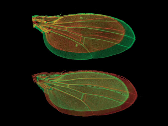 L’asymétrie de taille observée entre l’aile gauche (en vert) et l’aile droite (en orange) de la drosophile (mouche du vinaigre) est liée à une surexpression du gène de la Cycline G. Une équipe autrichienne et deux équipes françaises ont en effet cherché à comprendre le rôle de cette protéine dans le développement d’organismes parfaitement symétriques. Il s’avère donc que l’expression normale de la Cycline G est indispensable à la formation de mouches parfaitement symétriques.