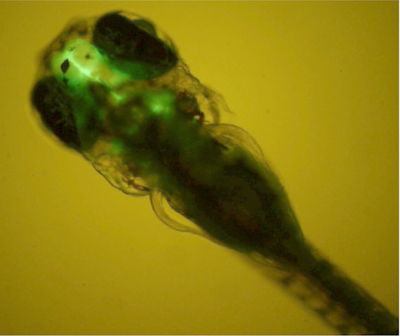 Cet embryon de poisson zèbre a été génétiquement modifié par des équipes de l’Inserm et de l’Ineris pour que son cerveau devienne fluorescent au contact de différents perturbateurs endocriniens. Ce modèle transgénique animal réagit à 21 substances dont les bisphénols, les œstrogènes de synthèse, certains androgènes et progestatifs synthétiques, venant confirmer ainsi l’action des perturbateurs sur le système nerveux central.