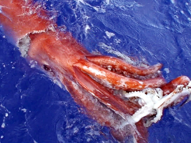 Cette prise exceptionnelle de calmar géant (Architeuthis) a été réalisée au Japon, par 640 mètres de fond, dans le Pacifique. Ces géants des grandes profondeurs peuvent atteindre 10 à 13 mètres de long et sont des nageurs hors pair !