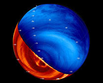 « Sur une planète, les vents sont généralement induits par les différences de températures entre l'équateur et les pôles, explique Pierre Drossart, directeur de recherche au Lesia* et responsable de l'instrument VIRTIS de Venus Express. Mais sur Vénus, la très faible rotation fait que la partie exposée au Soleil reste longtemps éclairée. Un gradient très puissant se forme ainsi entre le jour et la nuit. » C'est ainsi que les nuages tournent en seulement 4 jours autour de la planète !