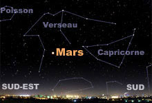 Mars est actuellement bien visible dans la constellation du Verseau (au sud/sud-est à minuit). Aucun problème pour l’identifier : c’est, de loin, l’objet le plus lumineux dans cette région du ciel.