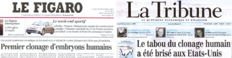 “Premier clonage d'embryons humains” pour Le Figaro ou “Tabou du clonage humain brisé” pour La Tribune… À la lecture de tels gros titres, le passant pourrait croire qu'une avancée scientifique majeure vient de se produire et que les premiers êtres humains, clones de leurs “parents” se préparent à voir le jour dans les neuf mois à venir.