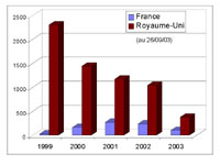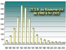 Avec plus de 180 000 cas recensés depuis l’apparition de l’épizootie, le Royaume-Uni est sans conteste le pays le plus touché par l’ESB. Si le graphique montre que la maladie est en phase de décroissance, elle n’est pas pour autant éradiquée : 560 cas ont encore été constatés au cours de l’année 2003.