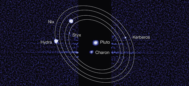 « L’Union astronomique internationale (UAI) a le plaisir de vous annoncer qu’elle a nommé Kerberos et Styx les quatrième et cinquième satellites de Pluton, précédemment connus sous les noms de P4 et P5 ». Ainsi débute le communiqué de l’UAI du 2 juillet 2013, conférant ainsi leur pleine identité aux satellites de Pluton découverts par le télescope spatial Hubble en 2011 et 2012.