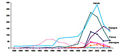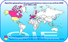 Paradoxalement, si le nombre de cas diminue, les experts notent une expansion géographique de l’épidémie. Ainsi, certains pays nouvellement entrés dans l'Union européenne sont touchés depuis 2001, comme la République Tchèque, la Slovaquie ou plus récemment la Pologne. Et quatre cas ont également été découverts en Amérique du Nord. Toutefois, cette expansion géographique ne pourrait être que la conséquence d'un dépistage plus systématique.