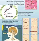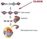 Comment cette horloge fonctionne-t-elle ? Grâce à une douzaine de « gènes d'horloge », codant pour des protéines qui contrôlent l'expression d'autres gènes. Parmi eux, le gène Clock joue un rôle central. Sans lui, l'horloge se dérègle. Jusqu'à présent, on pensait que la protéine Clock, issue de ce gène, était « seulement » un facteur de transcription qui régulait l'expression d'autres gènes. Mais l'équipe de Paolo Sassone-Corsi, de l'Institut de génétique et biologie cellulaire (Strasbourg), vient de démontrer que cette protéine possédait également une activité enzymatique capable de modifier le degré de « compaction » de l'ADN au sein de la cellule. Autrement dit, en remodelant les chromosomes, Clock rend les gènes plus ou moins accessibles, ce qui influence leur expression.