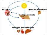 Toutes les cellules d'un organisme vivant possèdent leur propre horloge biologique mais il existe une horloge « centrale », située dans l'hypothalamus, au niveau des noyaux suprachiasmatiques. La destruction de cette horloge centrale entraîne la disparition d'un grand nombre de rythmes. Cette horloge possède une rythmicité propre, mais elle peut se re-synchroniser grâce à des facteurs externes. Ainsi, lors des changements de saison ou après un décalage horaire, l'horloge interne peut s'adapter aux nouvelles conditions et décaler son rythme. Parmi ces synchronisateurs externes, l'alternance lumière/obscurité joue un rôle primordial. Les noyaux suprachiasmatiques reçoivent en effet des informations lumineuses directement de la rétine.