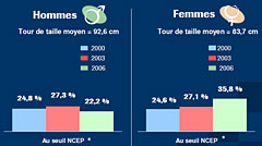 Au cours des trois dernières années, l'enquête ObÉpi montre que le nombre de femmes dont le tour de taille est supérieur à ce seuil est passé de 27,1% à 35,8%, confirmant ainsi les résultats obtenus pour le calcul de l'IMC, à savoir une hausse plus rapide et plus importante de la prévalence de l'obésité chez les femmes. En neuf ans, le tour de taille moyen des hommes a pris 2,4 cm alors que celui des femmes en a gagné 4,5.