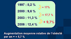 Lancée il y a neuf ans par le laboratoire Roche, l'Inserm et l'hôpital de l'Hôtel-Dieu (Paris), l'enquête ObÉpi (pour épidémiologie de l'obésité) confirme en 2006 les résultats des années précédentes : la proportion de personnes obèses dans la population générale vivant en France ne cesse d'augmenter.