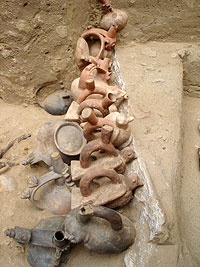 Parmi ces trésors, d'innombrables vases et pots en céramique, ainsi que des objets réalisés dans des alliages de métaux, des offrandes sous forme de membres ou de crânes d'animaux tels que le lama ou le puma, ou encore des masques et des poignards de cérémonie funéraires. Dans une seule des tombes découvertes dans la pyramide de l'Or, les archéologues exhument soixante-dix pots en céramique, aux motifs raffinés, représentant des figures humaines, divines et animales, ou encore des scènes de la vie quotidienne.