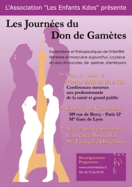 L'Association "Les Enfants Kdos" organise à Paris, les vendredi 1er et samedi 2 février 2008, deux journées de promotion du don de gamètes à l'intention des professionnels et du grand public. Conférences, ateliers, forum de rencontre sont au programme.