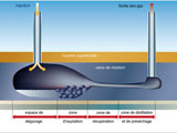 Le principal intérêt de la gazéification souterraine est de permettre l'accès à des veines de charbon qui seraient autrement inexploitables : trop profondément enfouies ou situées en mer. Le procédé « zappe » en effet toute la phase d'exploitation minière et les dangers qui en résultent, aussi bien pour les mineurs que pour l'environnement. Au lieu de cela, il utilise les techniques de forage de l'exploitation pétrolière. Une fois le gisement caractérisé – forme et nature du charbon bien identifiées –, deux forages sont effectués. L'un des puits sert à injecter l'air et la vapeur à haute température et sous pression au cœur du gisement, et l'autre est utilisé pour récupérer le gaz produit par une série de réactions entre le charbon, l'oxygène de l'air et les molécules d'eau de la vapeur d'eau.