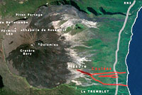 Sur le flan Est du Piton, loin du sommet, à environ 500 m d'altitude, une faille laisse échapper un flux continu de lave. Plusieurs chenaux se forment et viennent rapidement recouvrir la route nationale en contrebas sur plus de 1300 mètres de largeur avant de se précipiter dans la mer dans un immense nuage de vapeur.