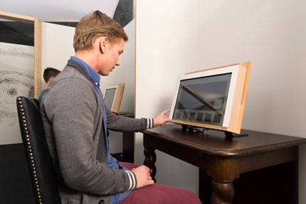L’artiste français Pierre-Laurent Cassière a conçu ce drôle de casque ou “schizophone” qui déspatialise les sons, pour que le visiteur se rende compte de l’effet produit par la déformation des perceptions (souvent présente dans les psychoses).