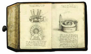 dans des carnets. Il trace les projets de machines qu’il invente, en en précisant certains détails comme les rouages, les poulies ou la façon dont les forces doivent s’appliquer. Dans lesmêmes carnets, parfois sur lesmêmes pages, il dessine des esquisses et des études de fgures ou de mouvements, il note ses réfexions sur l’art, ses observations sur les plantes, les animaux et les nuages, ses réfexions philosophiques et parfois même des devinettes, des rébus et ses listes de courses ! Tout au long de sa vie, il a ainsi rédigé desmilliers de pages, dont un grand nombre ont été conservées.